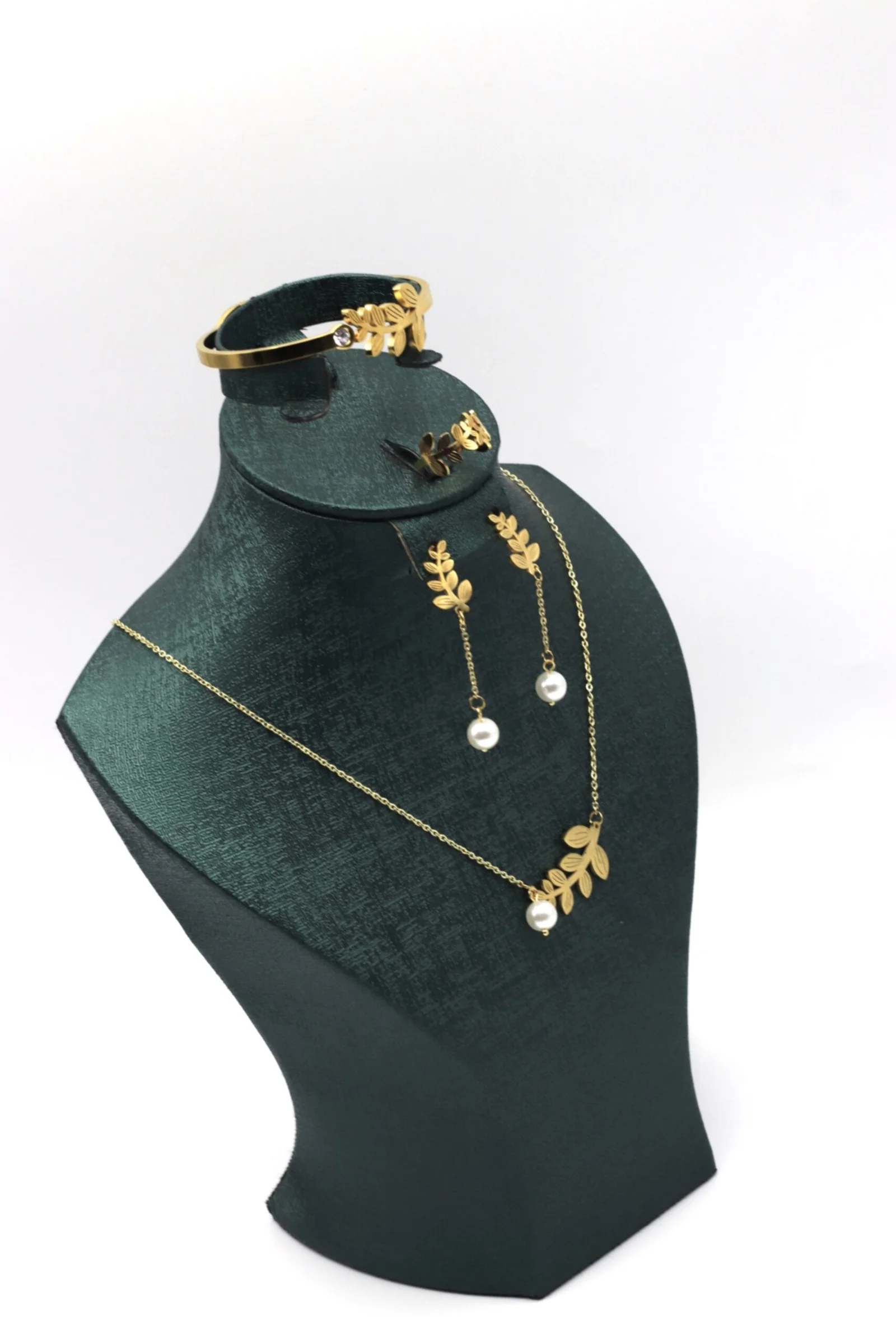 الطقم مكون من سوار انيق و خاتم عصري و اقراط لؤلؤ ساحرة و قلادة بتفاصيل ذهبية فخمة مطلي بطبقة ذهبية عالية الجودة + لمسة لؤلؤ ناعمة